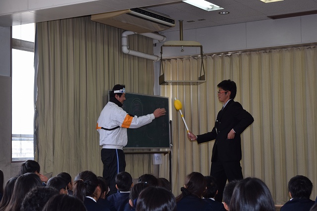 また、芸を教える方法を豊新小学校の先生がイルカの役になり、武田さんが餌のかわりに飴をあげて実演していただきました。