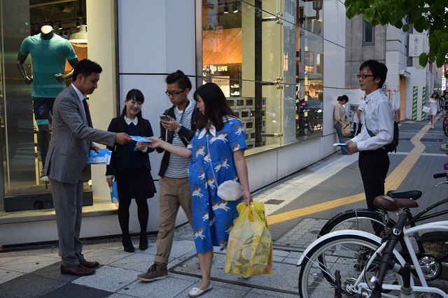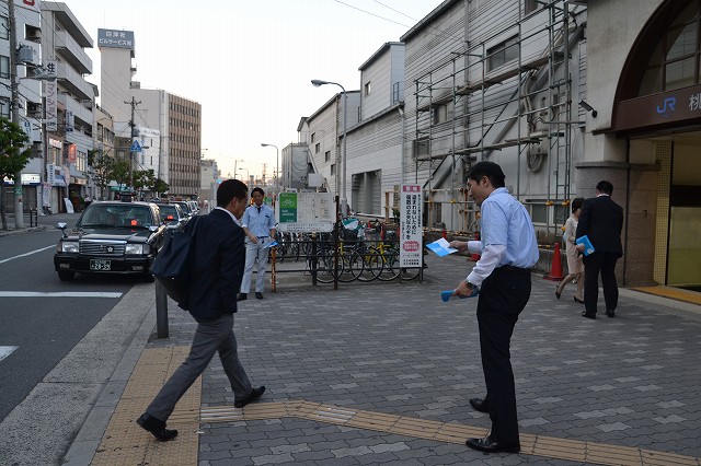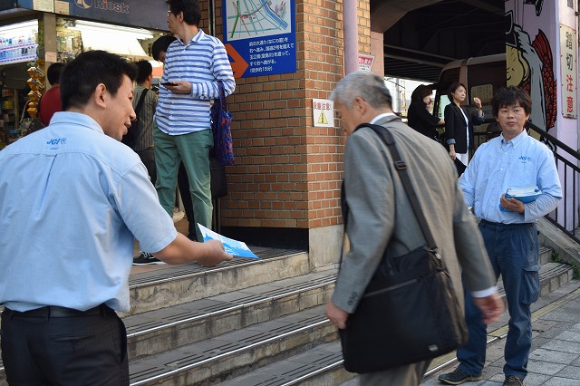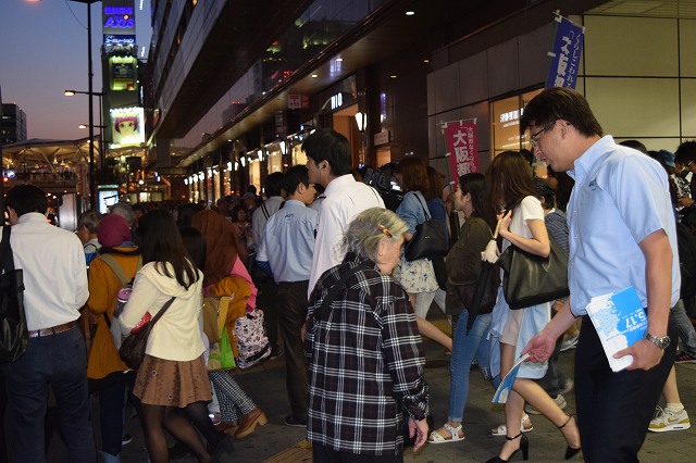 2015年5月13日18時から20時まで、『大阪環状線ジャック+』と題して大阪環状線、難波駅、心斎橋駅の13駅周辺にて、いわゆる『大阪都構想』に関する冊子の一斉配布を実施しました。