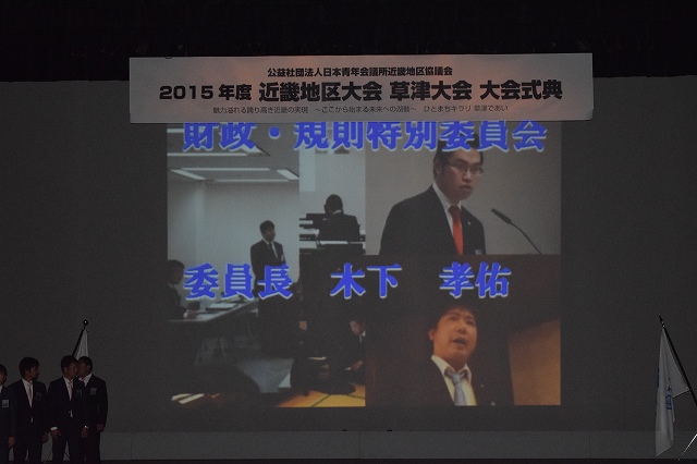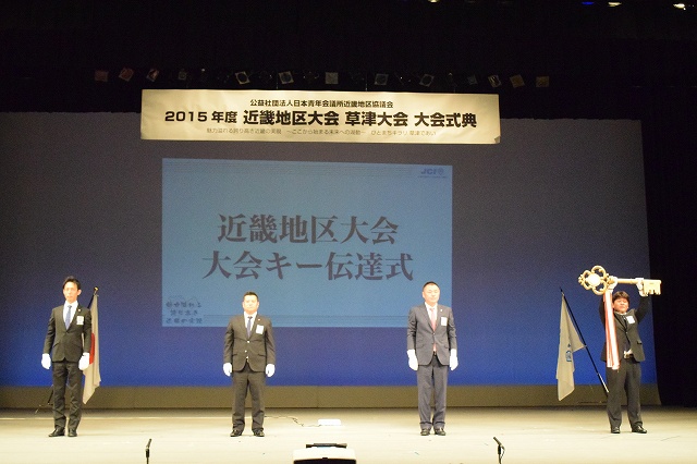 近畿地区協議会2016年度会長候補者として亀岡青年会議所の張本昌義君が、2016年度近畿地区大会主管LOMとして茨木青年会議所がそれぞれ紹介され、2016年度会長、主管LOMへの大会キー伝達式が行われました。
