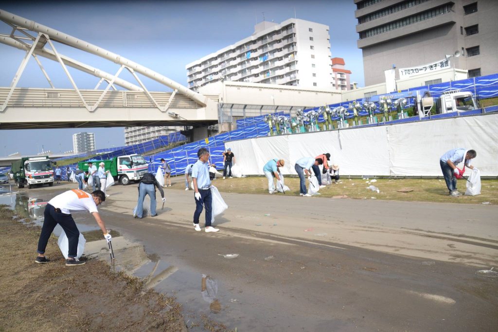 翌8月9日(日)の朝8時より、一般ボランティアの方々と一緒にゴミ拾いなど河川敷の清掃活動を行いました。