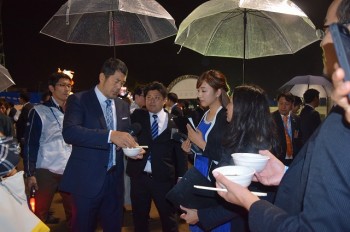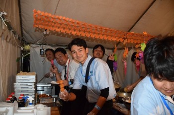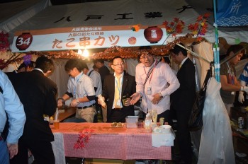 2015年9月25日(金)17時30分より、長根公園にて『大懇親会』が開催されました。全国の会員会議所から飲食ブースが出店され、大阪JCからは[たこ串カツ]を振る舞いました。イベントとしてJC全国野球大会表彰、髙田延彦氏によるおもてなし食堪能タイム、歌手グループMAXによるLIVEなどが行われました!