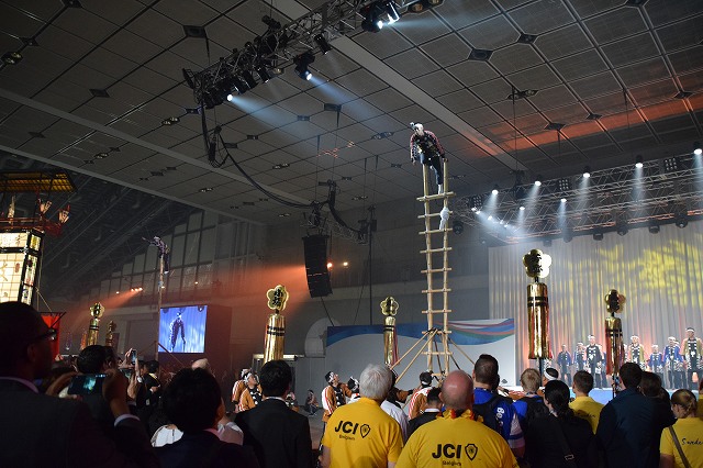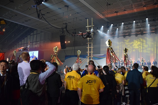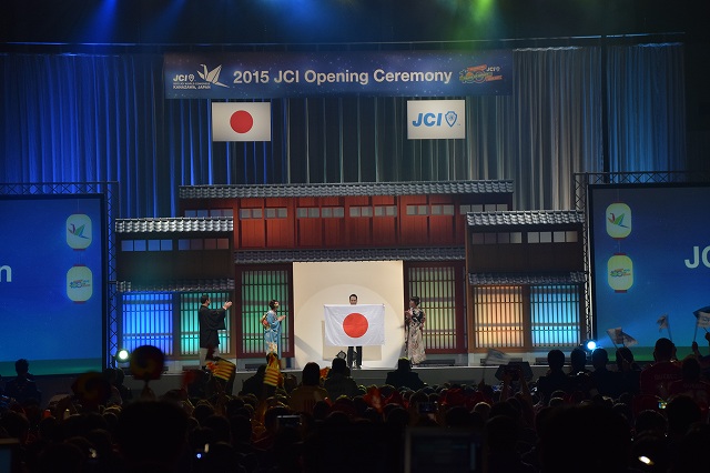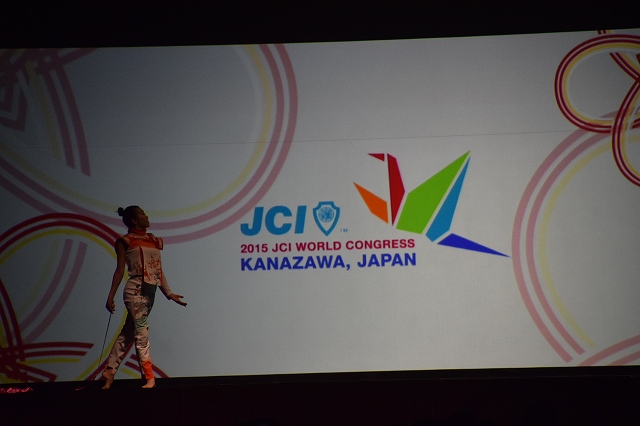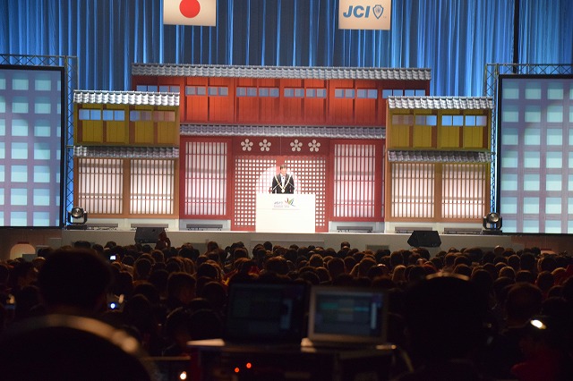 冒頭、金沢芸妓による舞が披露され、続いて、全世界の各国JCの会頭、歴代JCI会頭やJCI理事会構成メンバーが壇上から登場し、会場から大きな歓声があがっていました。