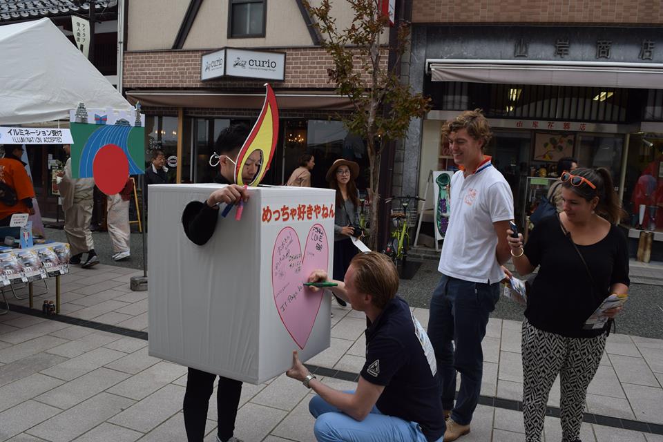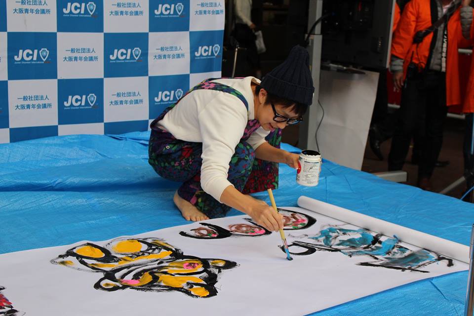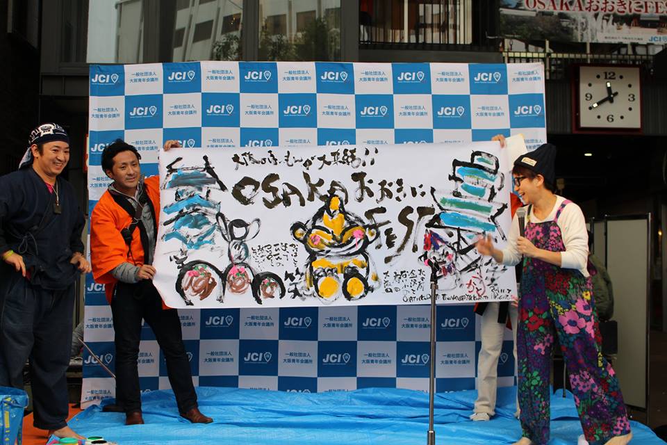 11時30分からは、アートパフォーマンスを行っていただきました。イラストレーターかとうようこ様は、たこ焼きなど大阪のシンボルを描き、書道家柴崎翔吾様は、その場に来ていただいた方の人柄を見て、素敵な言葉を書にされておりました。この心温まるコラボ作品は大盛況となりました。