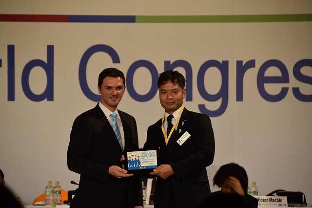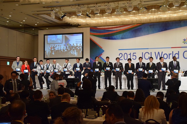 JCIの4つの地域大会への全出席であるグランドスラム達成者の表彰が行われ、次年度JCI会頭のパスカル・ディケ君と並んで大阪JCからも阪野由一君が表彰されました。