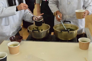 昆布のダシを取った味噌汁と、取っていない味噌汁で味比べを行い、昆布ダシの旨さを味わってもらいました。