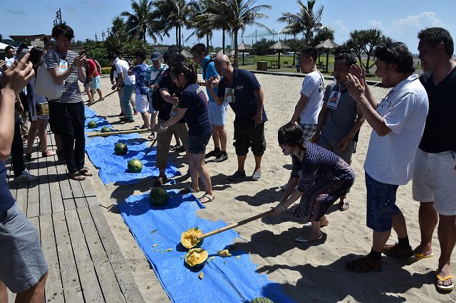 大阪JCメンバーとシスターJCのメンバーで協力して『スイカ割り対決』を行いました。