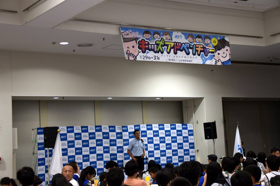 初めに一般社団法人 大阪青年会議所 城阪千太郎理事長よりこの3日間で新たな159人の仲間が誕生しました。ひとりでできないことも皆で取り組めば乗り越えれると体験できたと思います。今後もこの経験を活かして欲しいとの挨拶から始まり、子どもたちと寝食を共にされたファシリテーター、看護士の皆さんへのお礼の言葉があり、はるばるタイ・カンボジア・台湾・インドネシアからご参加いただいた事への感謝をお伝えいたしました。