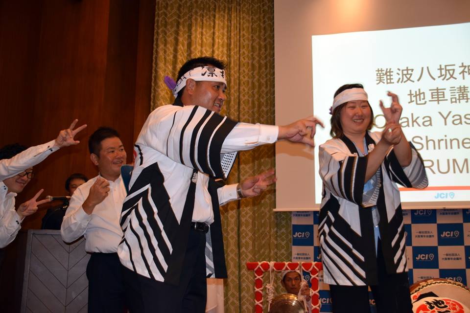大阪の文化「難波八阪神社の地車講」「大阪締め」の実演が行われ、TOYPメンバーに祭りの法被(はっぴ)のプレゼントがあり、踊りはもちろん、鐘や太鼓を体験いただきました。