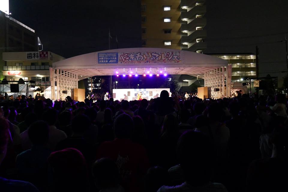 住道駅前末広公園では、にぎわいマルシェが大阪の食文化、海外からの留学生が創作たこ焼きを競い合うワールドグルメ、海外モデルのカットショーや地元大東のアイドルグループだいどーるず、ダンス、スカッとジャパンのイヤミ課長でお馴染みの木下ほうか氏をお招きして大東の魅力をお伝えしました。また、MINMIスペシャルライブがあり、MINMIと大阪桐蔭高等学校吹奏楽部の演奏共演が実現し、会場は大変盛り上がり、来場者も吹奏楽部員も大変興奮していました。