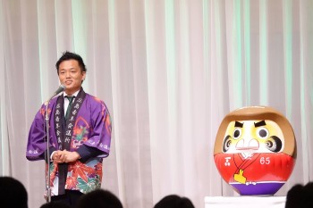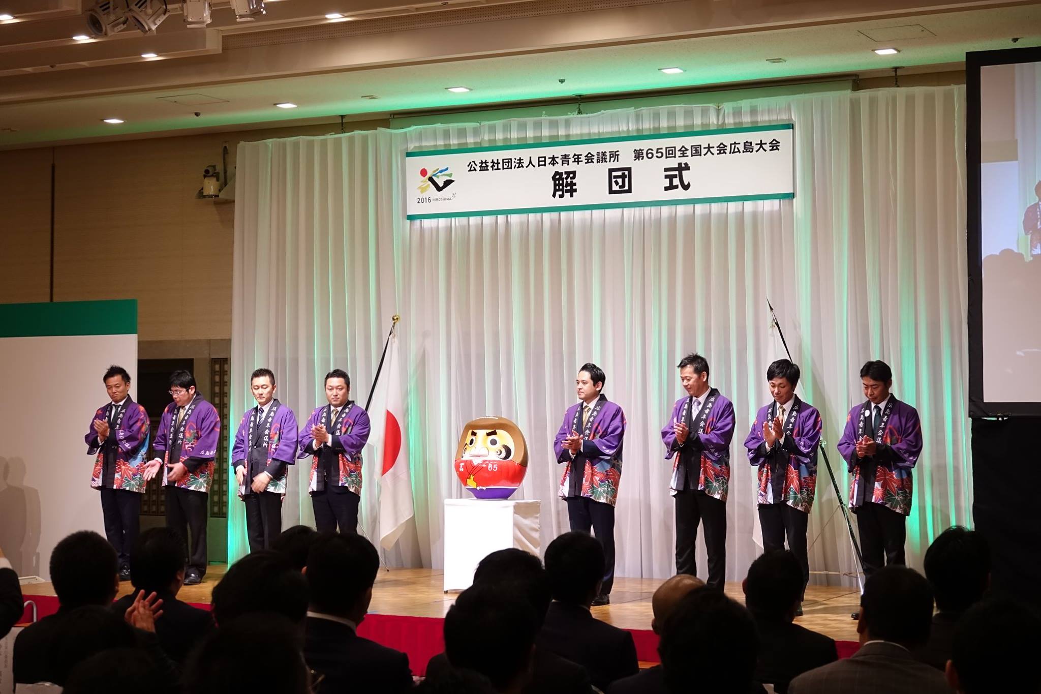 一般社団法人広島青年会議所理事長高見仁君より開催地LOMを代表してご挨拶をいただきました。大会の成功を祝して達磨の目入れ式が行われ、会場中から祝福の拍手が送られ、公益社団法人日本青年会議所会頭山本樹育君により最後の筆入れがありました。
