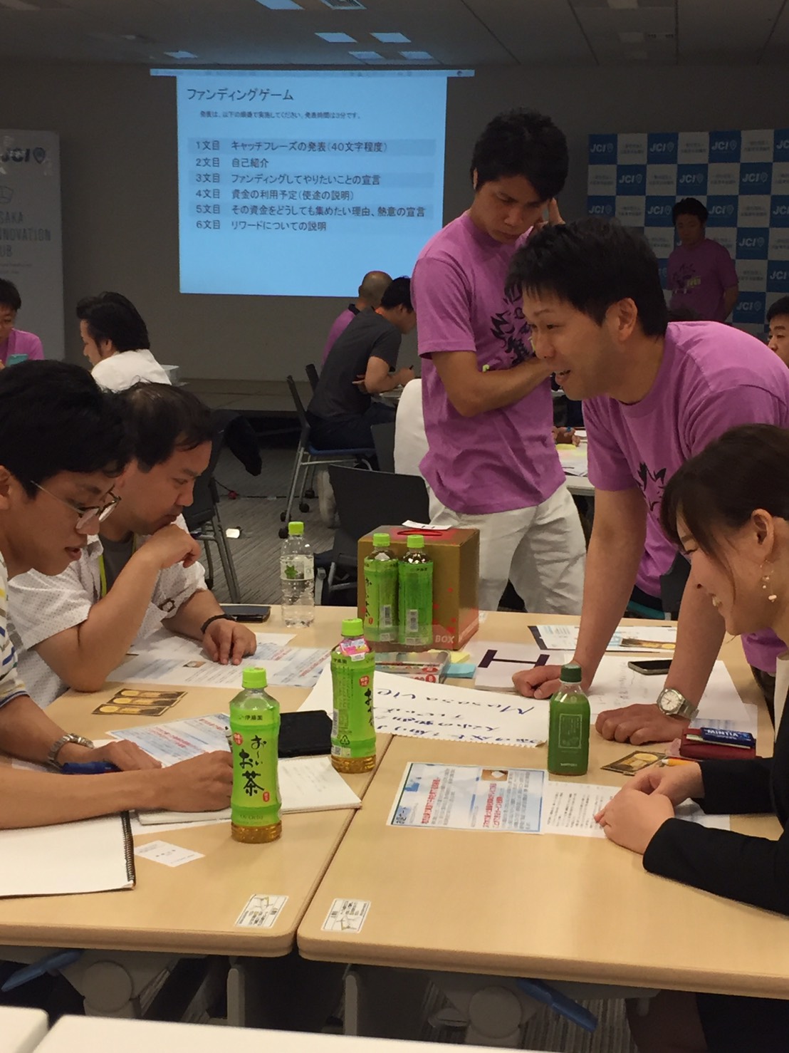 講義項目<ファンディングゲーム>では、受講生がそれぞれのチームに分かれ、実際に投資対象となったサービス・商品を、「自分たちならどのようにプレゼンするか?」をお題に、ステージにてそれぞれのチームがプレゼンを実施しました。