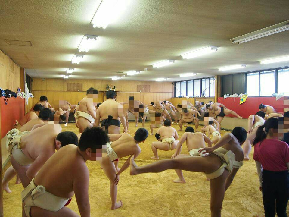 小学生から大学生までの力士が大人の力士に胸を借りて順番に稽古をつけてもらっていました。