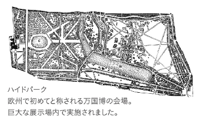 19世紀のなかば、各国の物産を一堂に集めて陳列する「国際博覧会」の必要性が、欧州で提唱されました。これを受けて1851年、25カ国の参加を得て、ロンドンのハイド・パークで「大博覧会(The Great Exhibition)」が開かれました。