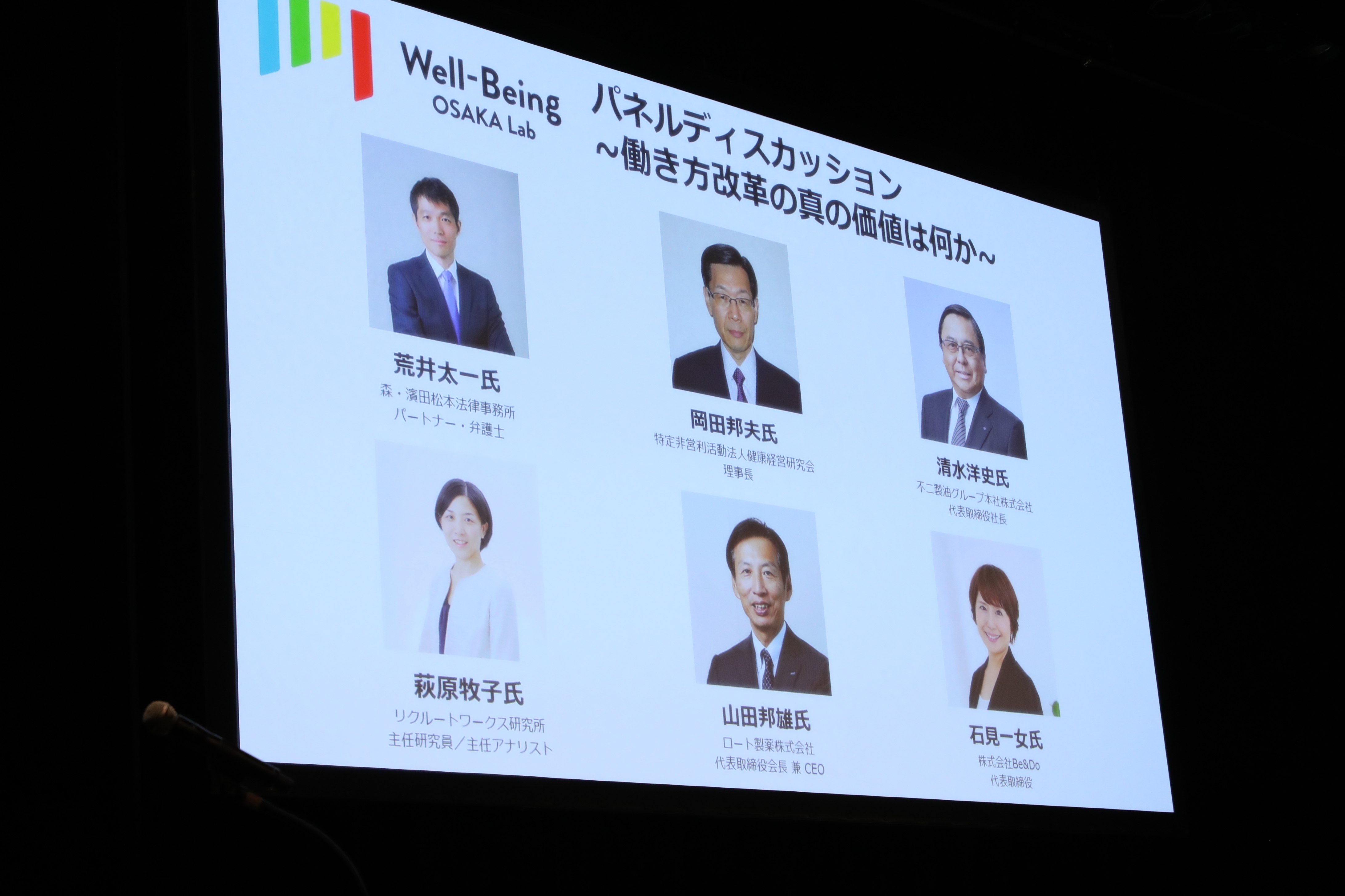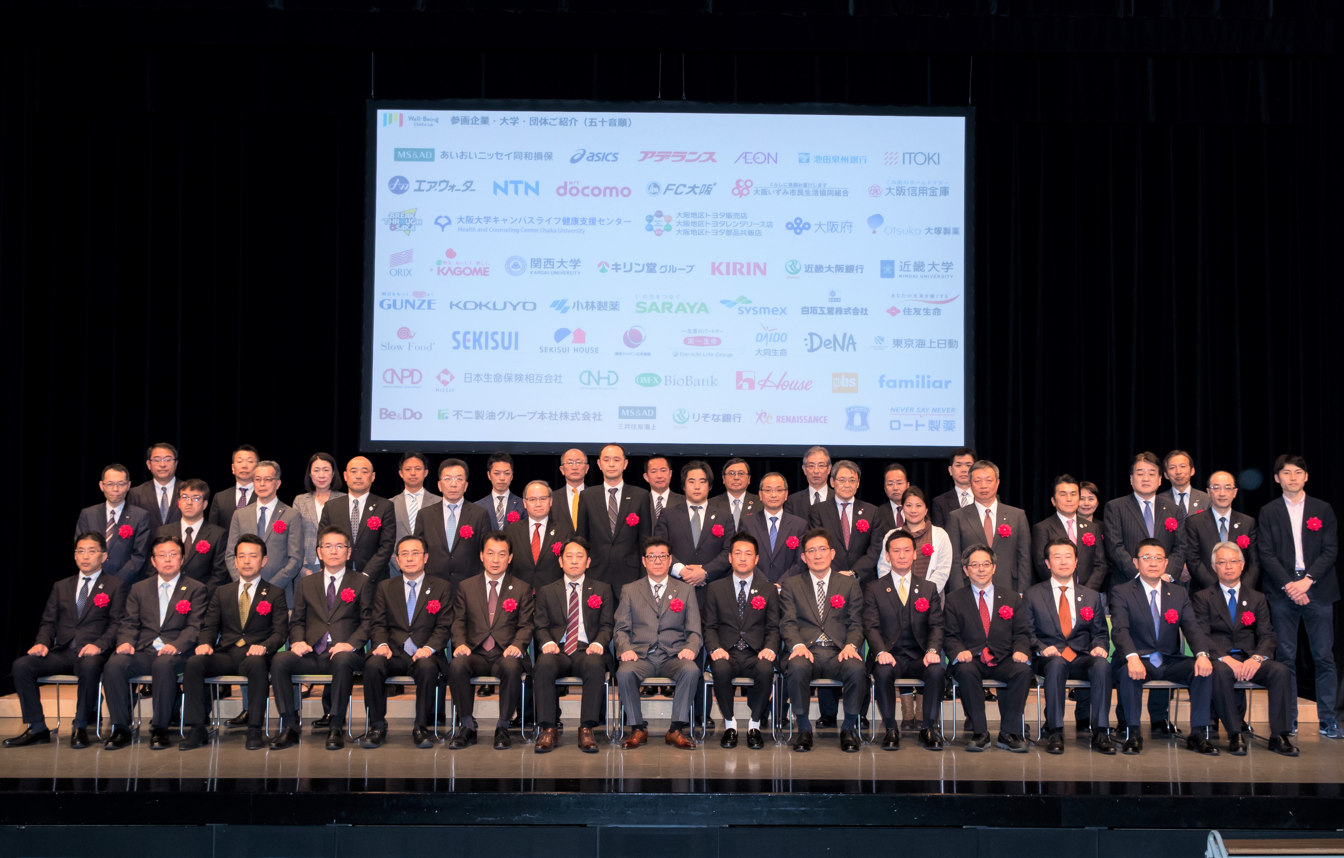 大阪府知事 松井一郎氏をはじめ、ロート製薬株式会社 代表取締役会長 山田邦雄氏、不二製油グループ本社株式会社 代表取締役社長 清水洋史氏、特定非営利活動法人 健康経営研究会 理事長 岡田邦夫氏など、大阪を代表する著名な方々にお越し頂きました。