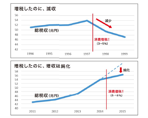 要するに、政府が「財政健全化」と銘打って緊縮策を展開し緊縮した分、経済活動は必然的に「縮小」します。政府は日本最大の経済主体。その政府がオカネを使わなくなればそうなるのも当たり前です。さらには増税によって国民の将来への不安は増大し、国民一人当たり年間10万円以上もの消費を減らしているのが現状です。結果、政府は税収を減らすという愚かな状況に。つまり現在の日本経済にとって悪循環を生み、景気悪化と財政悪化に拍車をかけてしまう大きな過ちなのです。