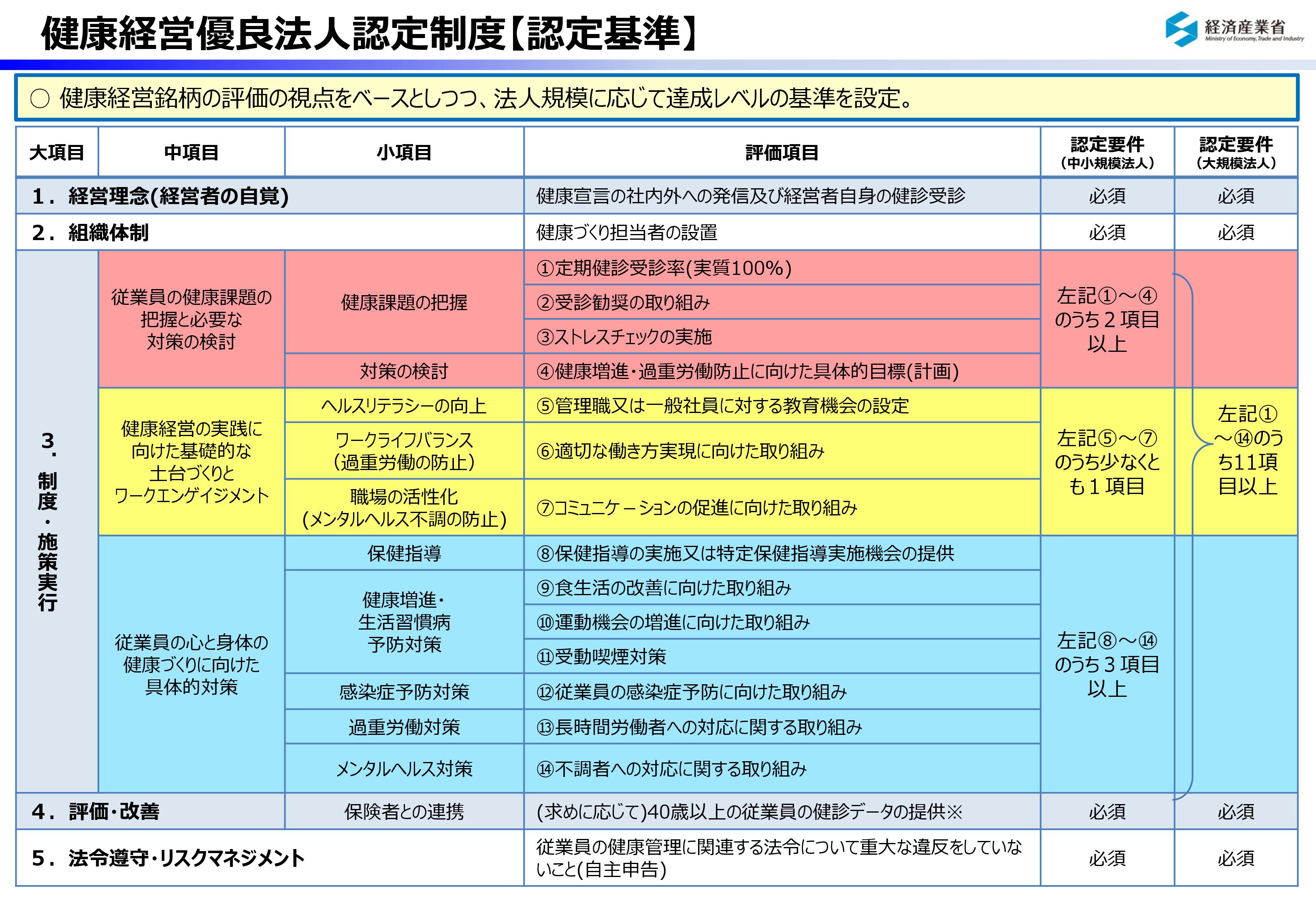 今回は、どうすればその健康優良法人に認定されるのかをご紹介させて頂きます。中小企業に対する「健康経営優良法人制度」の認定基準は、次の事項を必須としてその他、14の評価項目によって評価されています。