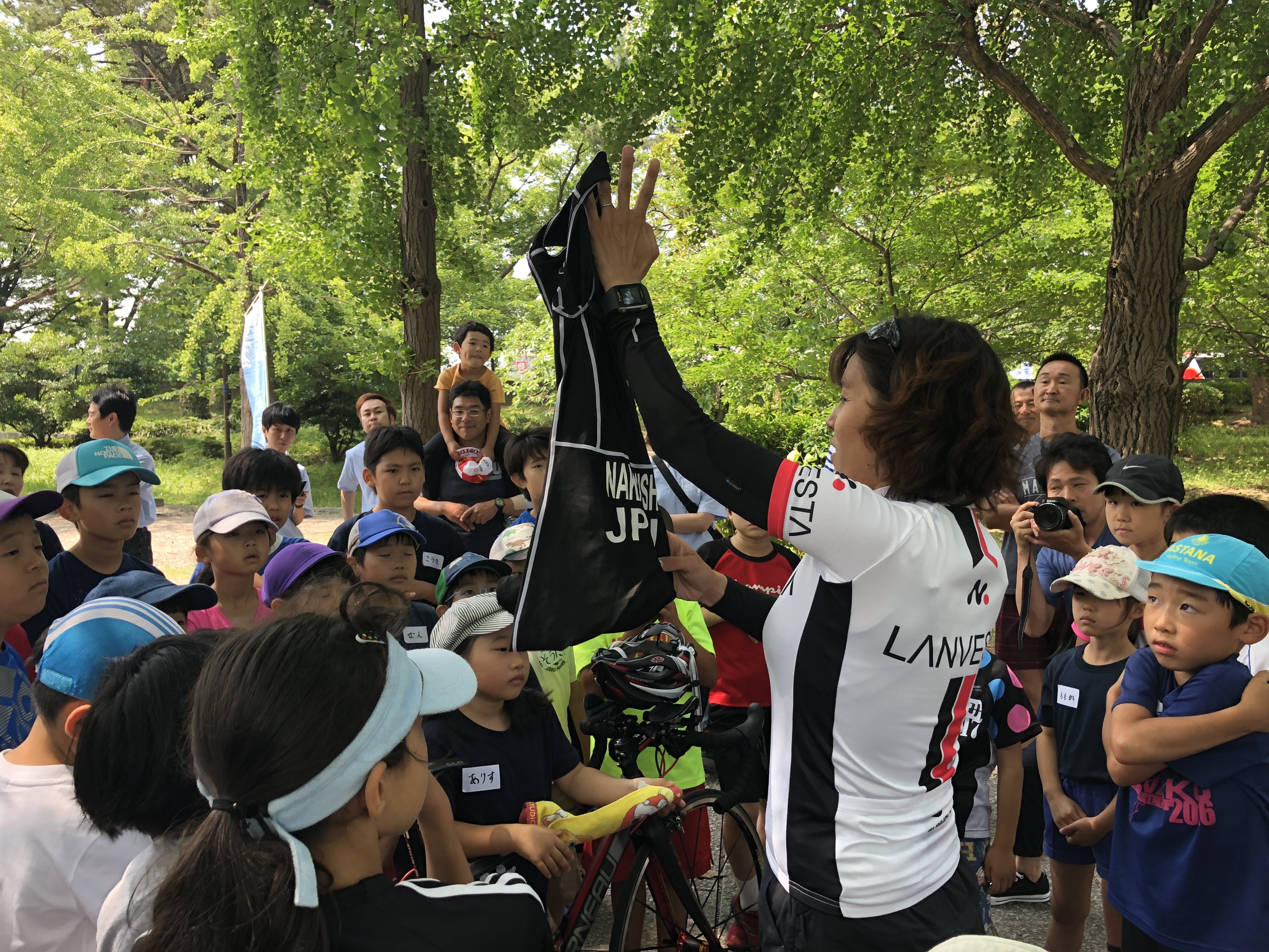 実際にキッズ用のロードバイクをローラー台に設置して漕いでみたり、実際の競技を想定したトランジションレースなど、晴天に恵まれた中で、思う存分チャレンジしていただきました。
