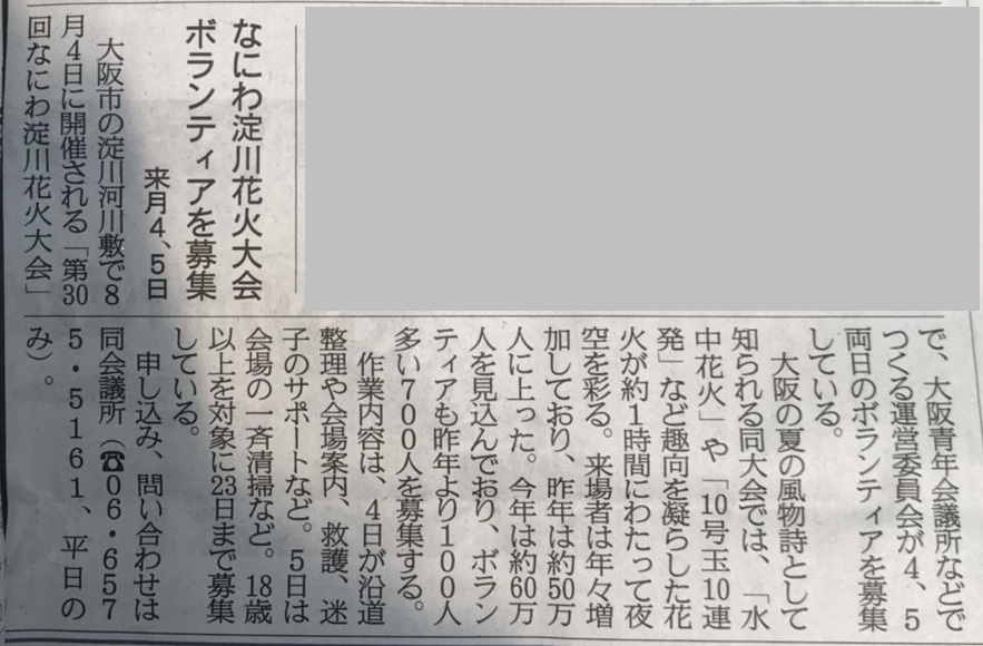 7月20日(金)付けの「産経新聞」に、なにわ淀川花火大会のボランティア募集記事が掲載されました。