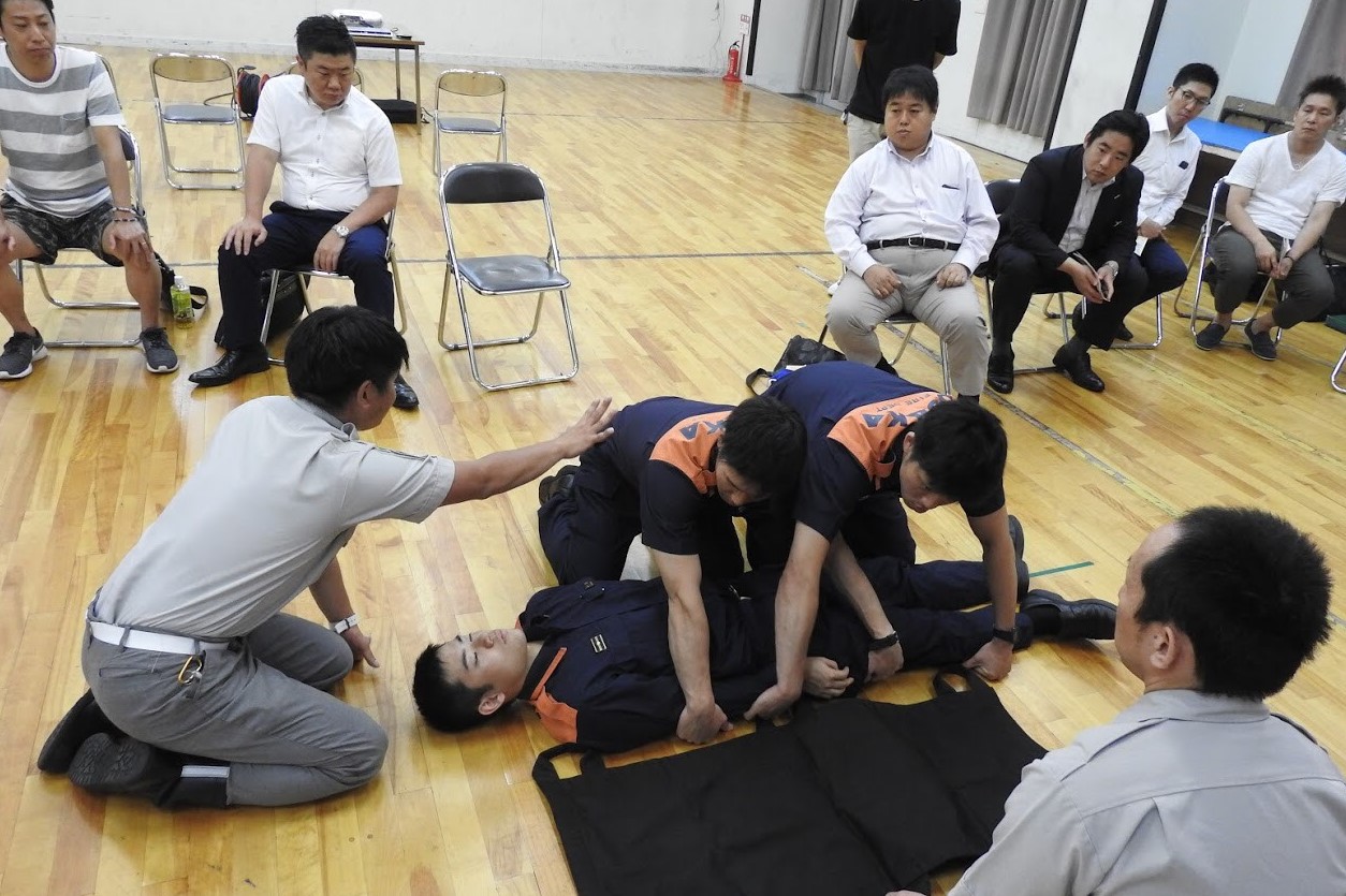 当日の安全対策のため、17名の皆様にご参加頂き、AEDの使用方法、担架での緊急搬送方法等を学んでいただきました。