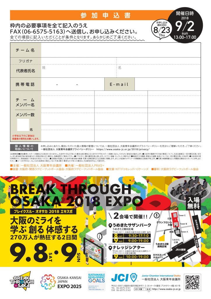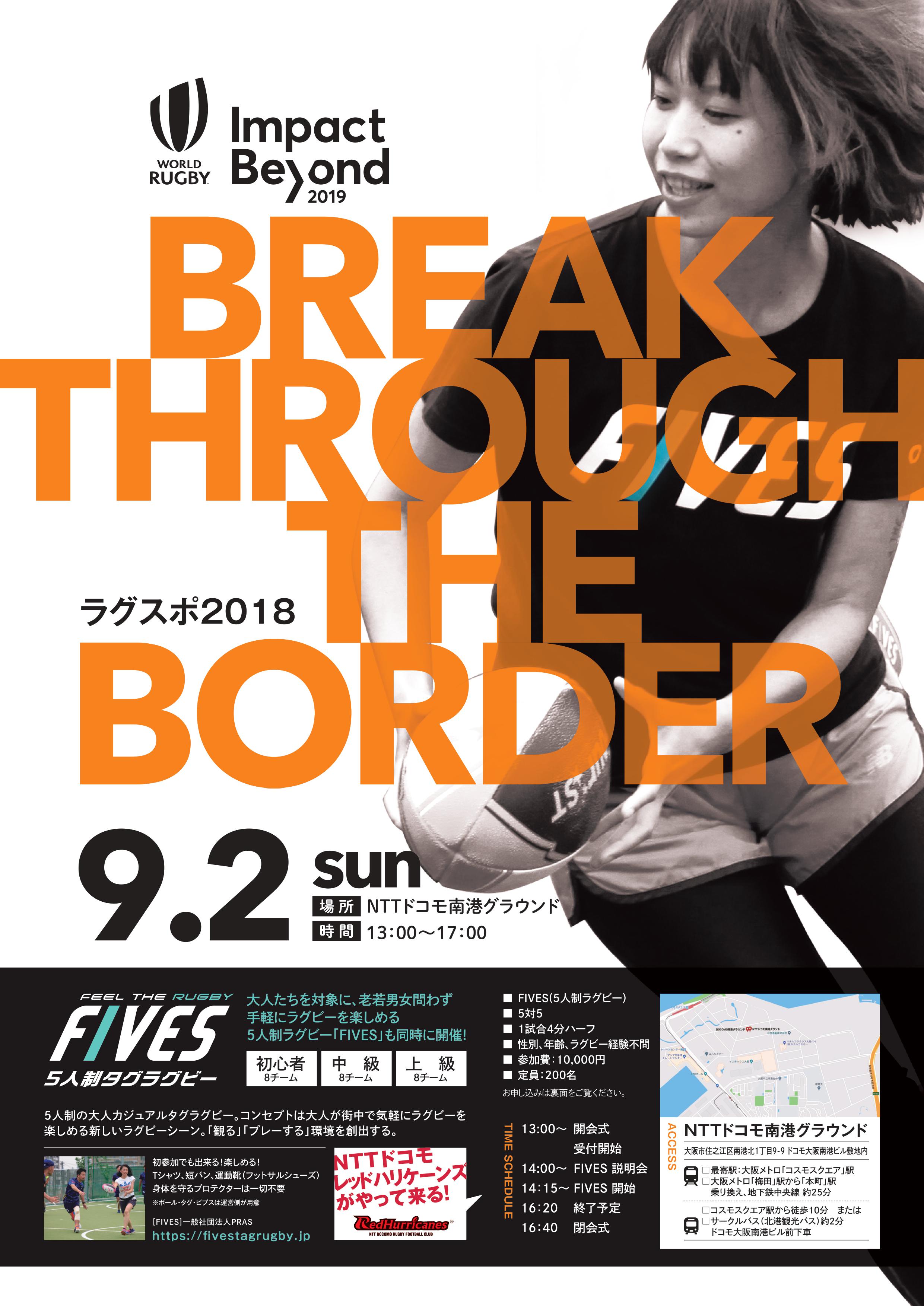 2019年、ここ大阪の地でも開催されるラグビーワールドカップを盛り上げるべく、私たち一般社団法人大阪青年会議所が主催します『BREAK THROUGH OSAKA 2018 EXPO』(9月8、9日)の口火を切る形で 【BREAK THROUGH THE BORDER~ラグスポ2018~】 という『FIVES』の大会を、 【9月2日(日)】 に開催いたします。