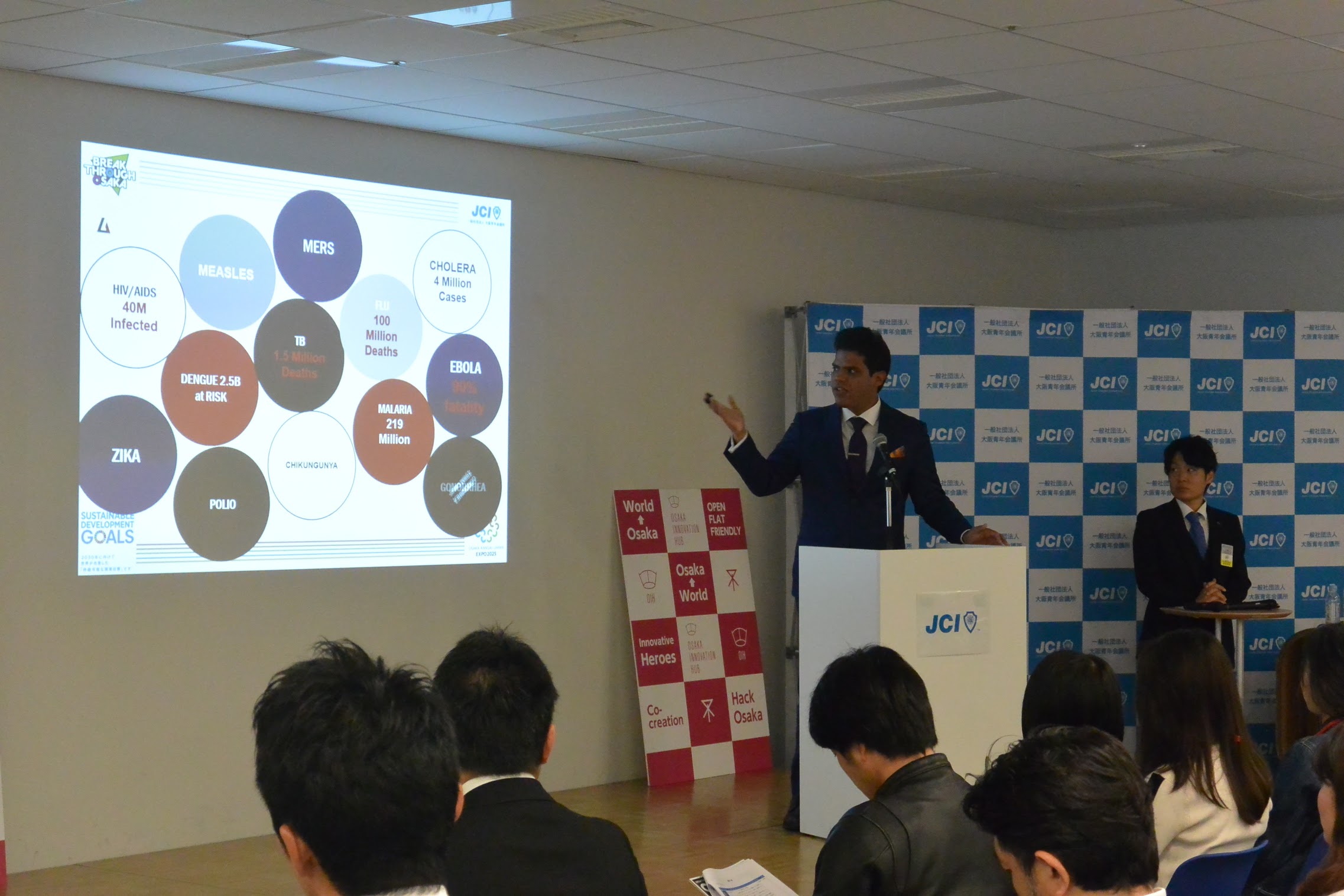 開講式では国連ヤングリーダーであり、人工知能、疫学的専門知識およびデータ分析を使用して主要な疾病の発生を予測するツールを開発した疫学企業であるAIMEの共同創設者兼CEOであるRanier Mallol氏、SDGsを推進している団体に所属しており、事業戦略を実践している小原愛氏もお招きして、基調講演を行いました。