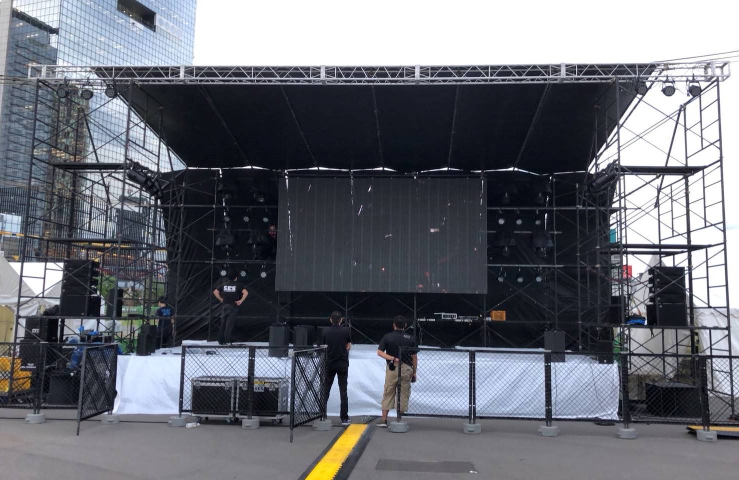 うめきたサザンパークでは、メインステージの舞台、照明が組みあがってまいりました