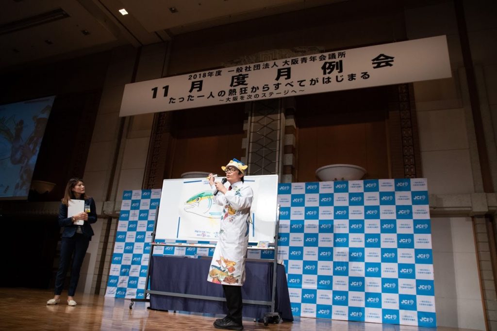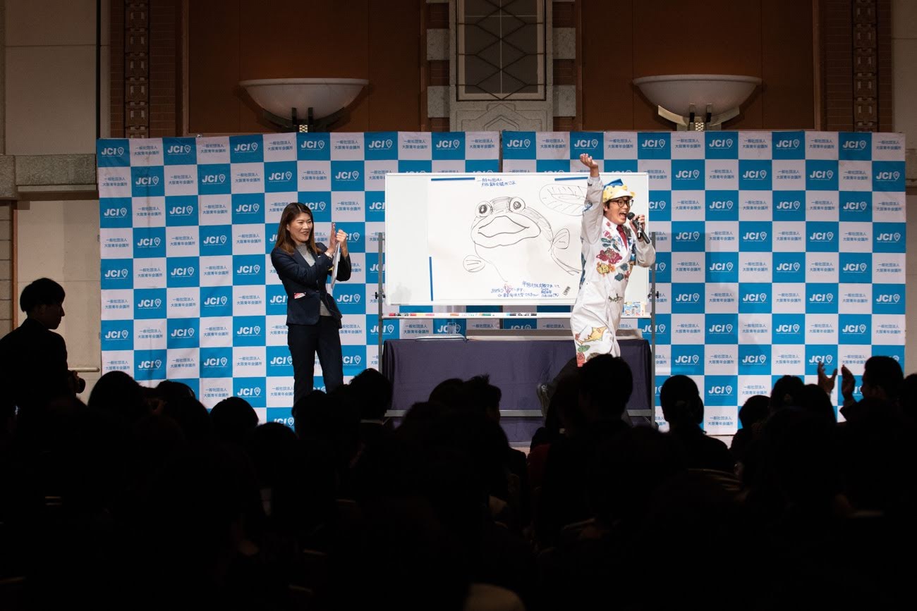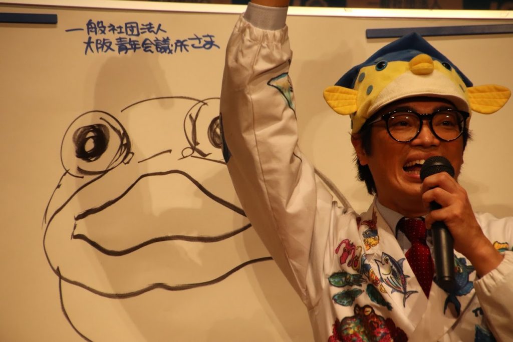また本会では、1年間を通じて協力いただきました「大阪市立工芸高等学校 映像デザイン科」の生徒達による、動画を使った発表。また、魚類学者である「さかなクン」をお迎えし、お絵書きおさかなクイズからSDGsと環境問題までご講演いただきました。