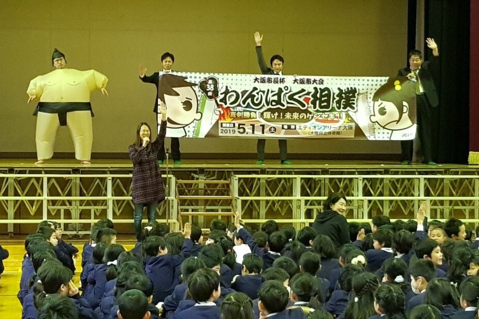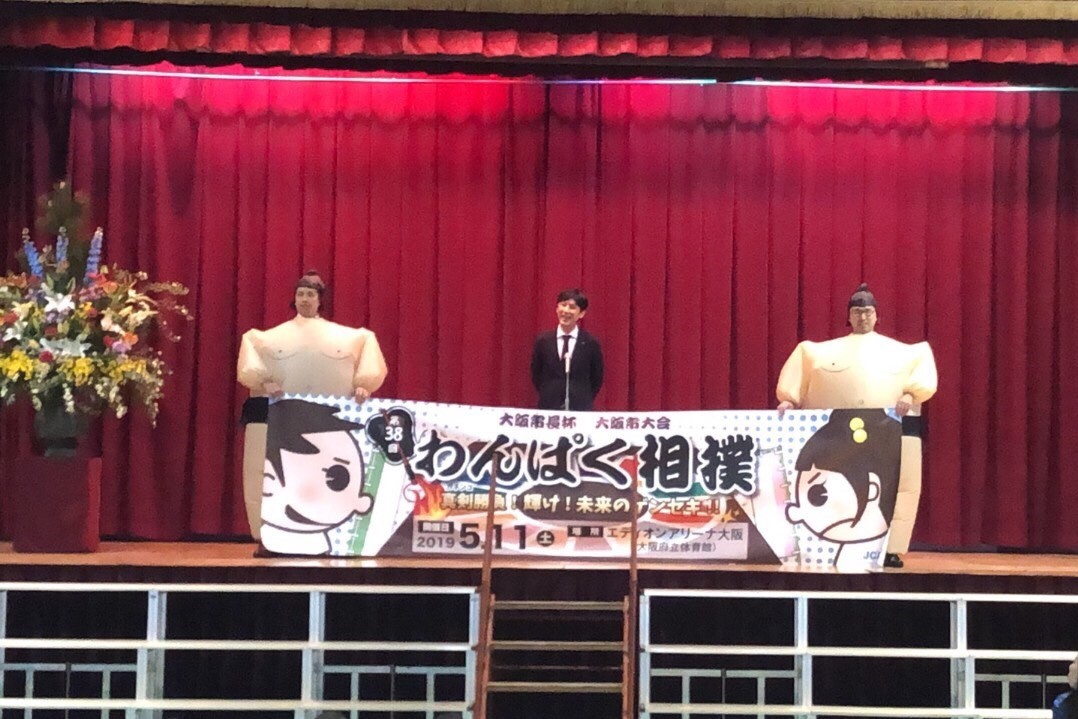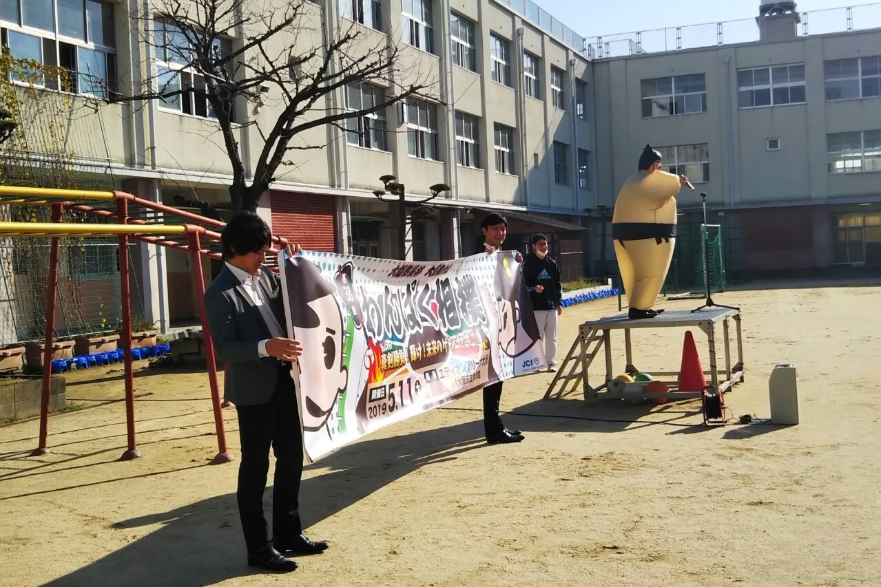 全校朝礼の時間をいただき、わんぱく相撲のPRをさせていただきました。