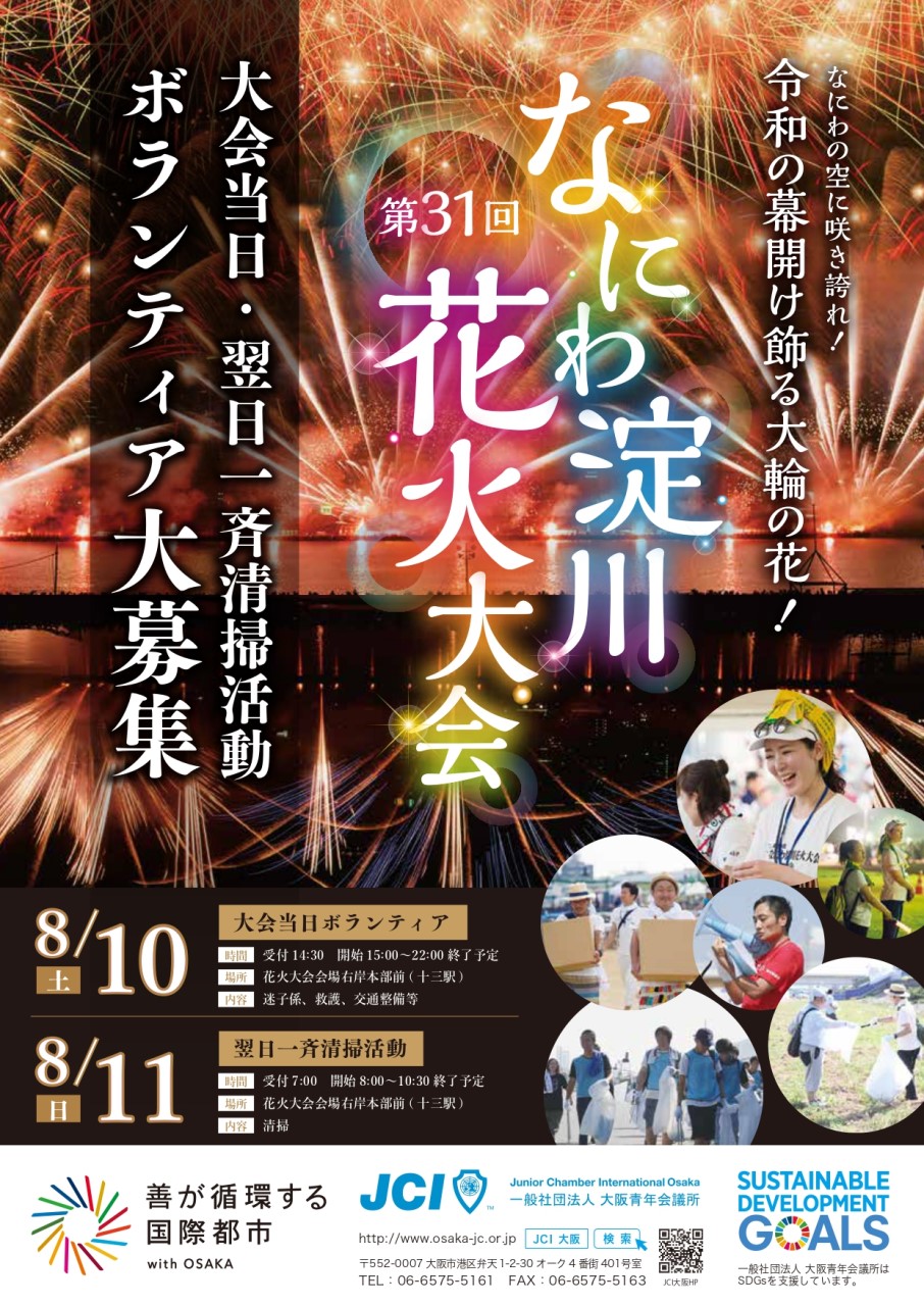 大阪青年会議所は、昨年と同様に、花火の当日と翌日清掃の運営協力やボランティアを担当させて頂きます。