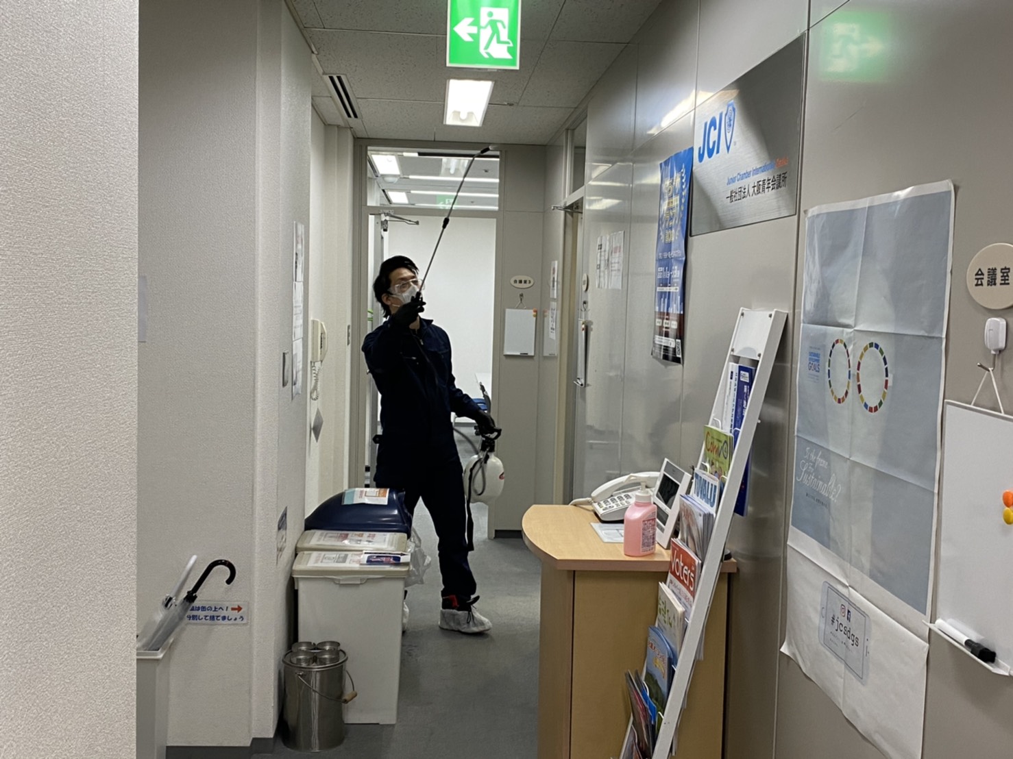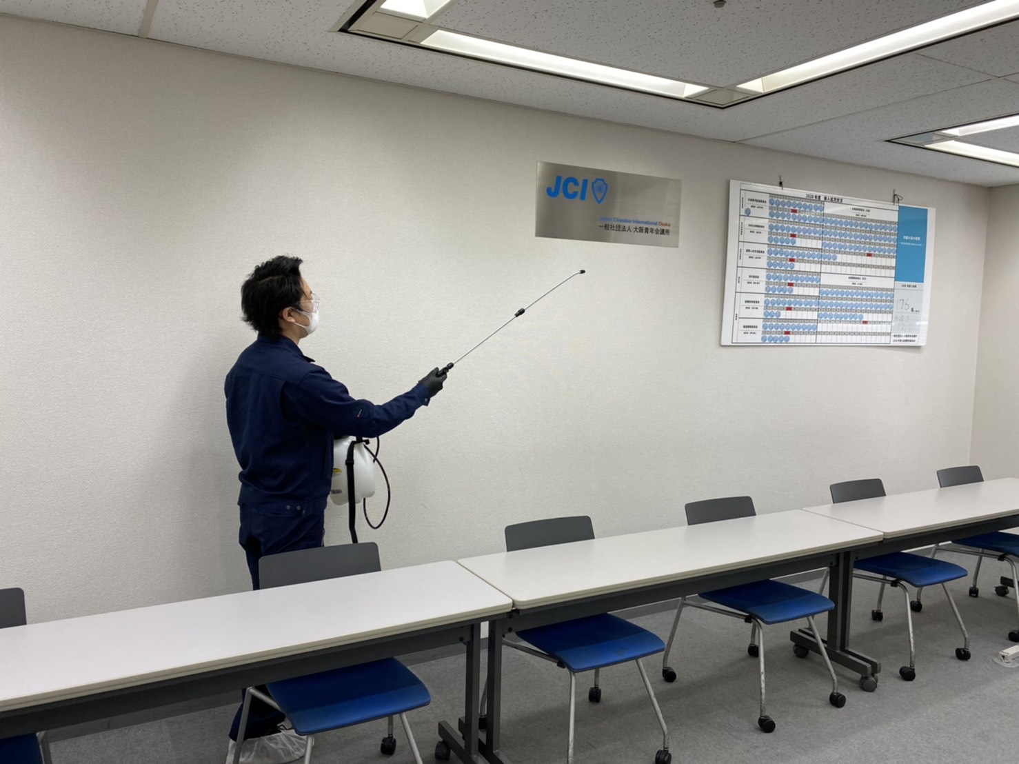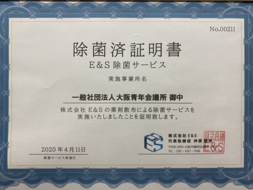 大阪青年会議所事務局の消毒作業が4月11日(土)完了いたしました。 消毒作業は終了しましたが、引き続き不要不急の来所は控えていただきますようご協力の程よろしくお願いいたします。 会員の皆様におかれましては、すでに配信させていただいております新型コロナウイルス(COVID-19)感染拡大に関するご案内第2版、関係各所からのガイドライン等踏まえ慎重に行動していただきますようご理解とご協力よろしくお願いいたします。