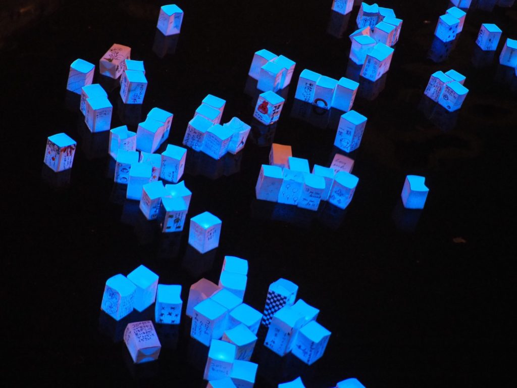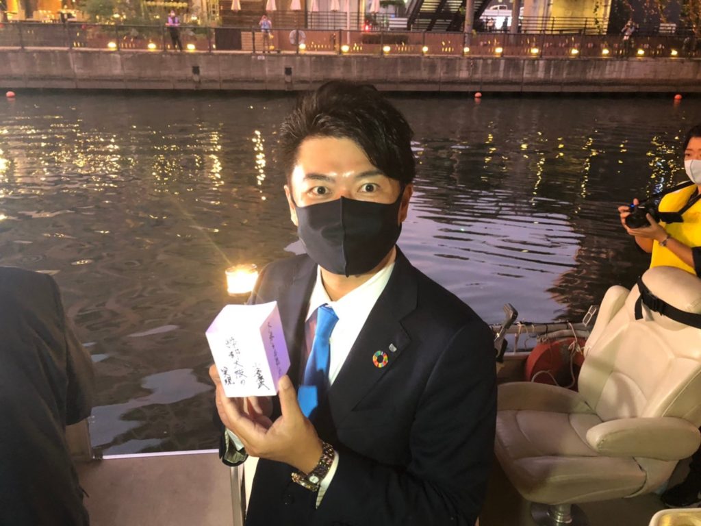 そして、コロナ禍と戦い続ける医療従事者の皆様へ感謝の気持ちとひとときの安らぎが届きますように、また大阪に住み暮らす皆様、世界中の皆様へたくさんの希望が届きますようにとの想いを込め、みんなで手作りした2020個の灯篭を道頓堀川に流しました。