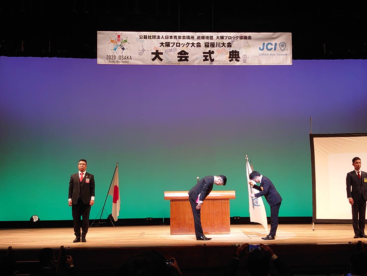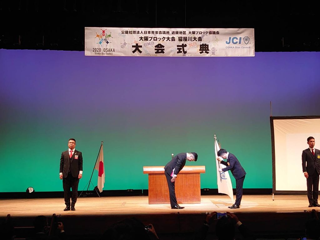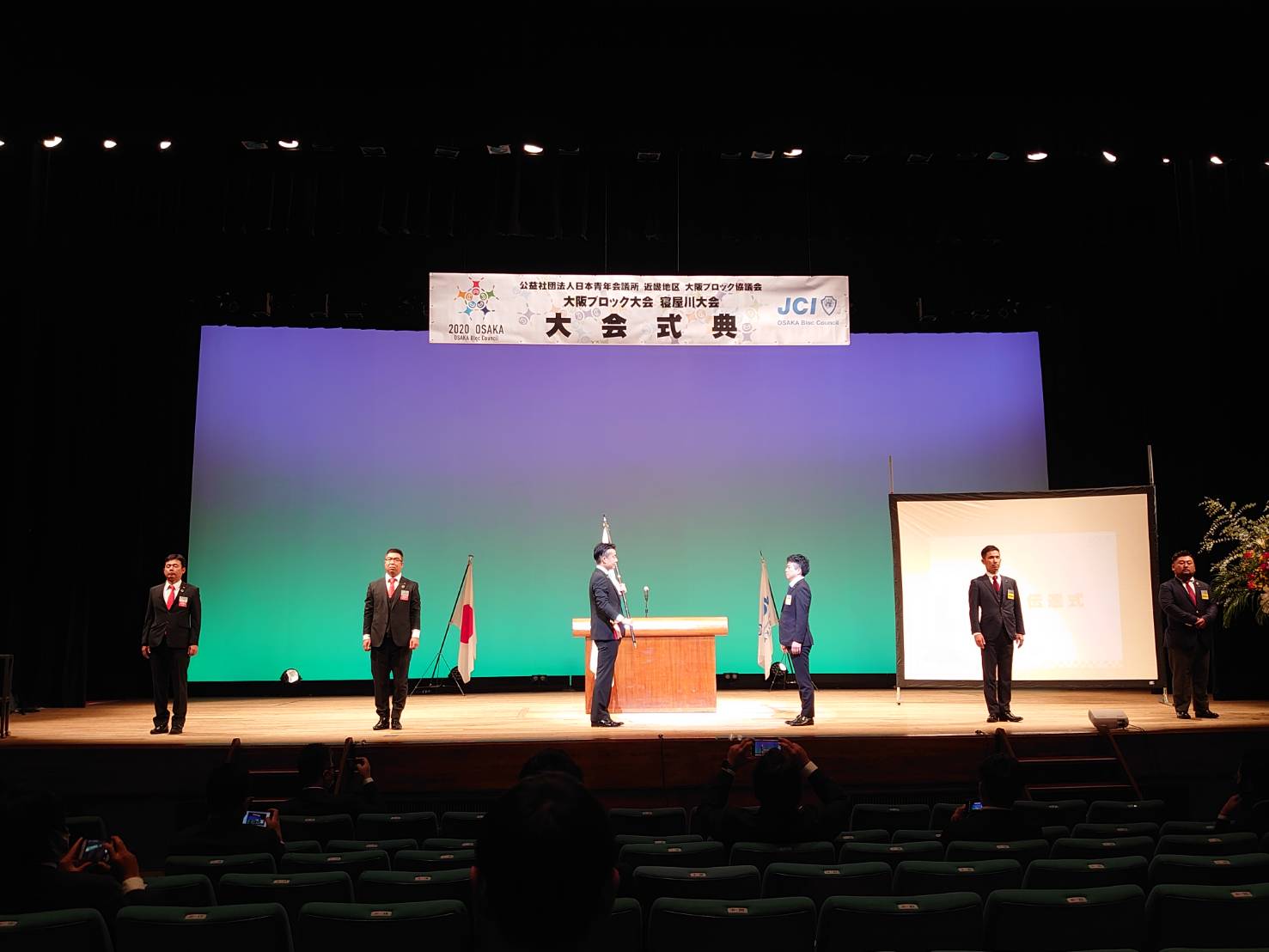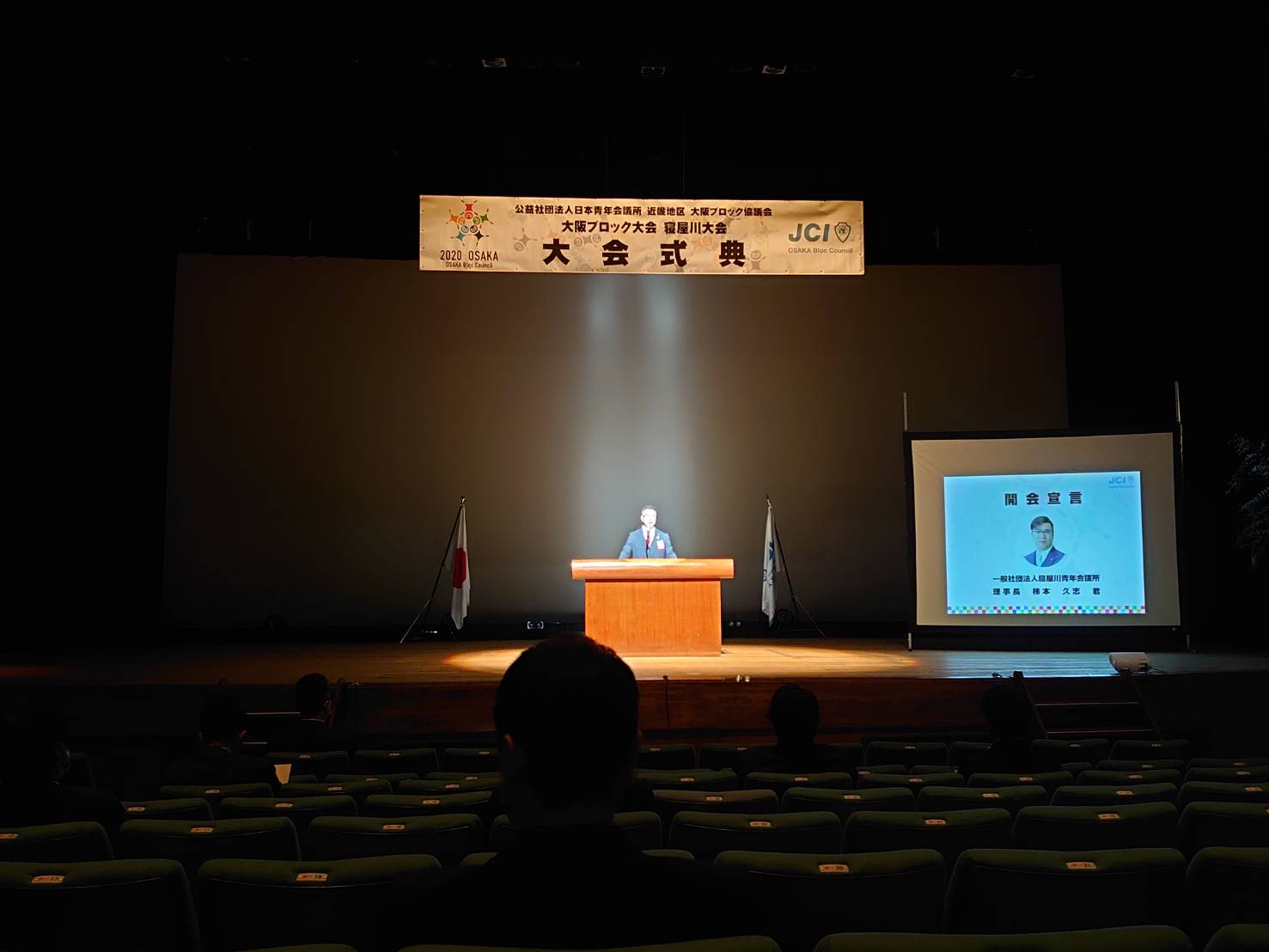 開催場所である一般社団法人寝屋川青年会議所 理事長 柿本久志君より開会宣言がなされ、大会式典では、大阪ブロック協議会 第56代 会長 北川雅史君、次年度会長である一般社団法人守口門真青年会議所 理事長 東野篤史君より挨拶があり、2021年度の大阪ブロック大会開催予定地が岸和田であると発表されました。