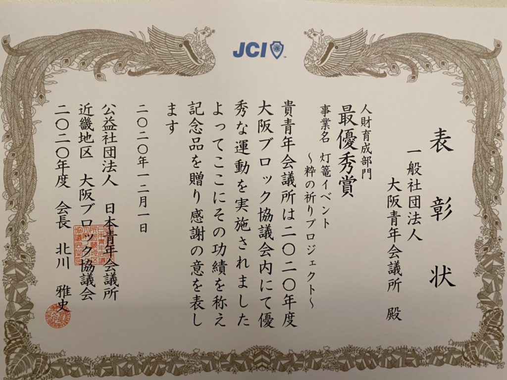 多くの事業がアワードを受賞される中、大阪青年会議所が取り組んだ『灯篭イベント~粋の祈りプロジェクト~』が人材育成部門にて最優秀賞を見事獲得いたしました!