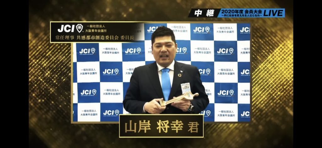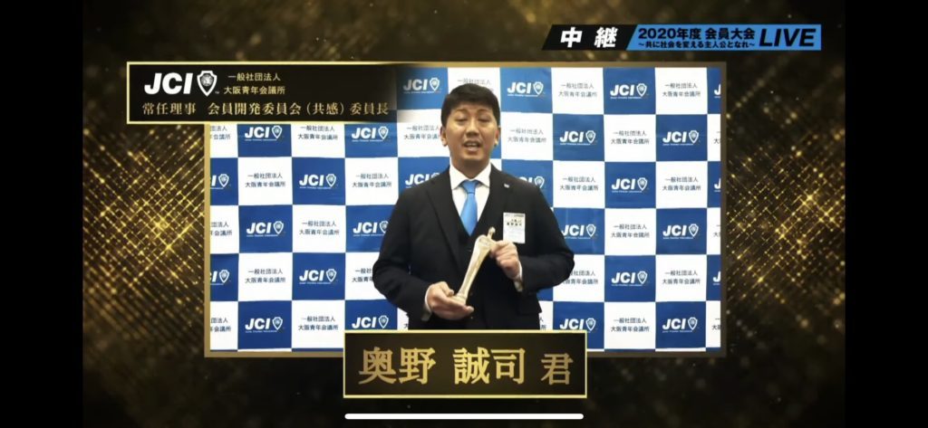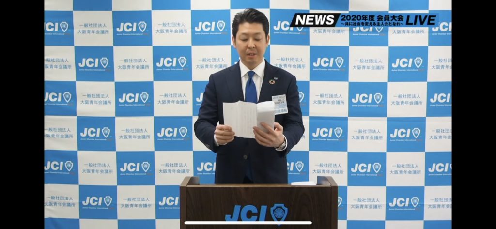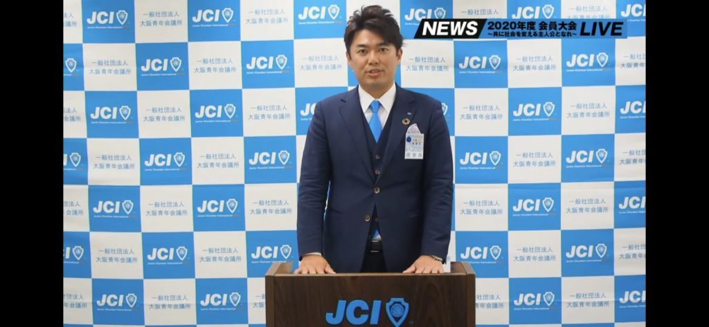 まずは、この様々な事象が起こり、普段ならできることもできなくなってしまった怒涛の1年を常に前向きに牽引した小倉理事長より総括スピーチがあり、2020年度の大阪には大きな変化があり、年始は実地での開催ができた事業も、春以降はオンラインでの事業開催を余儀なくされたが、そこであきらめるのではなく、今、大阪青年会議所では何ができるのか、今だからこそできることを考え、献血事業や粋の祈りプロジェクトを開催することができ、粋都大阪の実現されたと語られました。