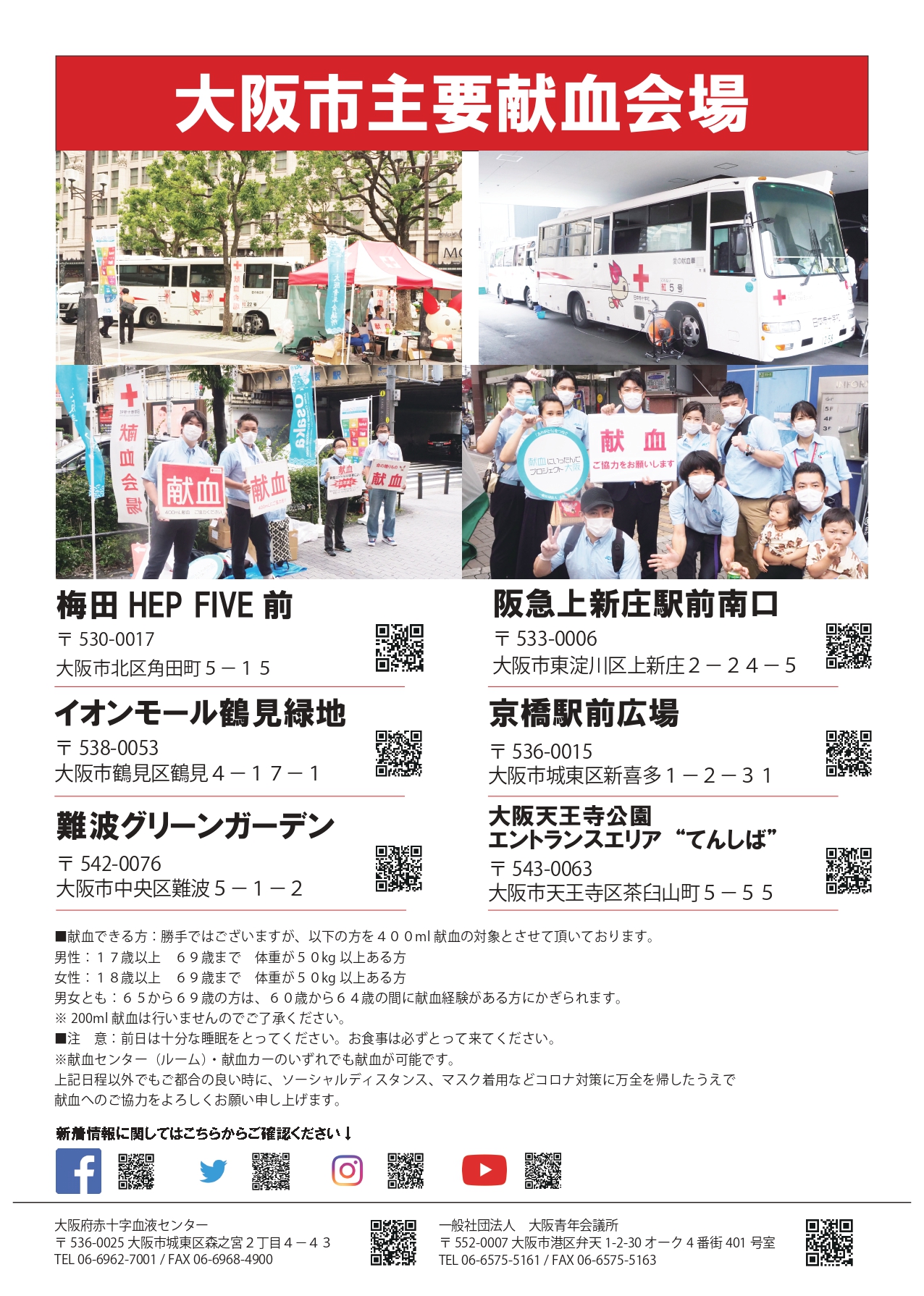 ※上記日時以外でも大阪府内献血ルーム・献血バス各所で献血が可能です。