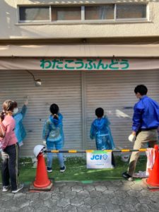 当日は、天気にも恵まれ地域の方々にたくさんお集まり頂き、商店街のシャッターを塗り替える作業を行いました。