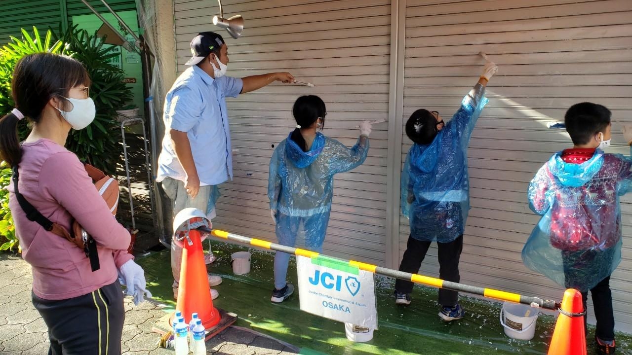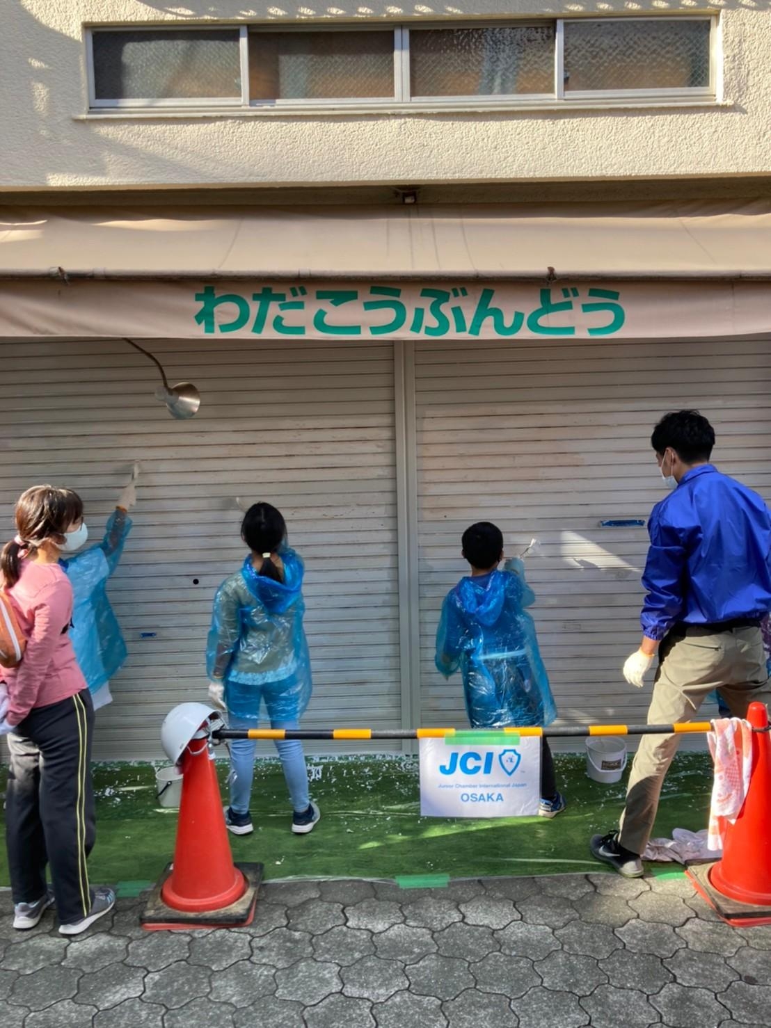 当日は、天気にも恵まれ地域の方々にたくさんお集まり頂き、商店街のシャッターを塗り替える作業を行いました。