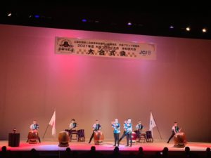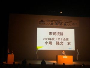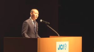 大会式典では、主管青年会議所であるJCI岸和田 理事長 泉本 真宏君の開会宣言に始まり、来賓祝辞では、岸和田市長である永野耕平氏に続き、JCI大阪よりJCI会頭として出向している小嶋隆文君より祝辞がありました。本大会が盛大に開催されたこと、東野会長を始めとする大阪ブロック協議会の皆様のJCIへのご支援ご協力についての感謝の意が述べられました。