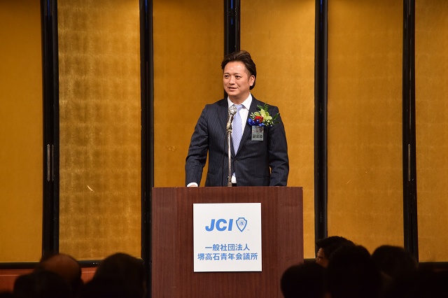 堺高石青年会議所第61代東口理事長のご挨拶で始まり、歴代理事長挨拶には第30代理事長の奥中先輩がご挨拶されました。