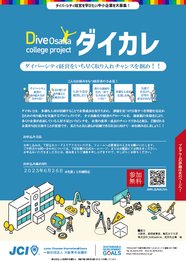 このたび、大阪青年会議所では、これからの未来を担う若い大学生を対象に、持続可能な社会を創っていくため、活動の中核となり、広く波及することのできる人財の育成を目的とした事業を行う事になりました。