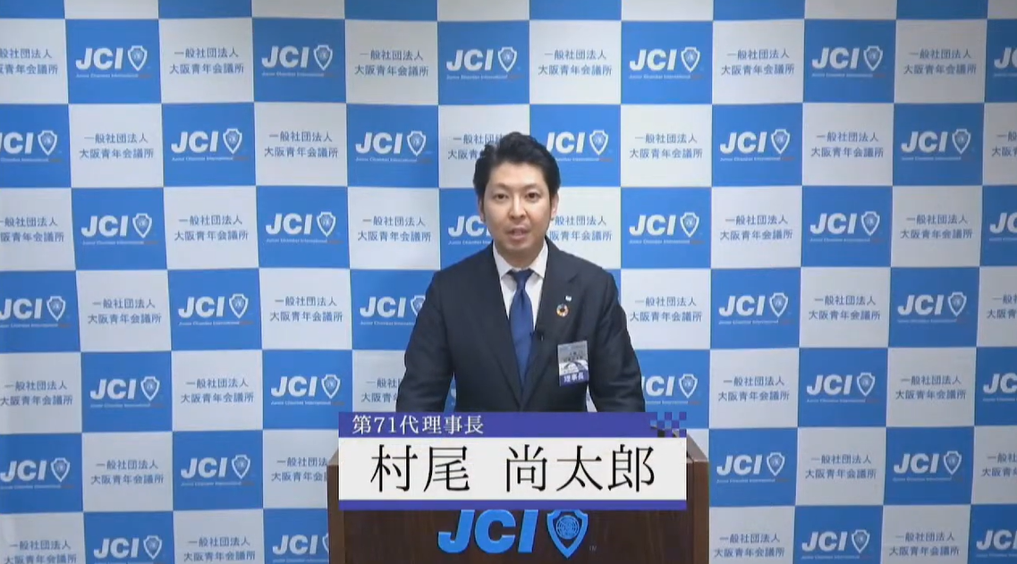 村尾理事長による挨拶と今年の大阪JCの活動報告ののち、JCI会頭の小嶋隆文君のJCIのテーマである「世界平和、ワンフューチャー」実現へのご挨拶をいただきました。