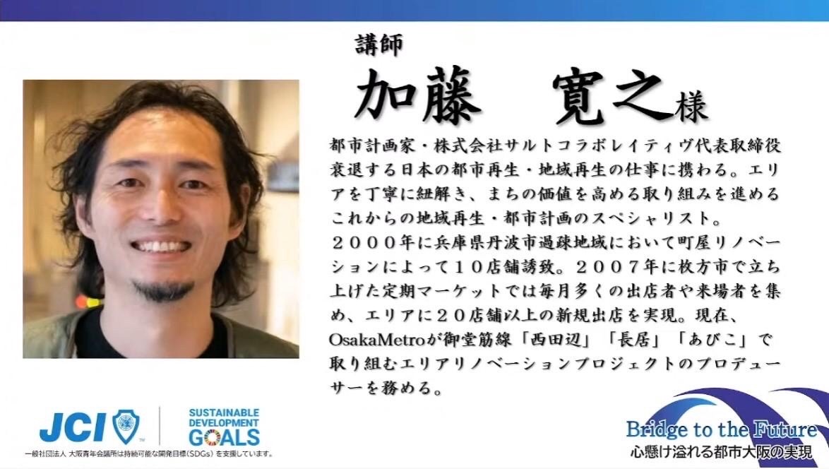 基調講演では、都市計画家であり、株式会社サルトコラボレイティヴ代表取締役の加藤 寛之 様を講師にお迎えし「次世代へ繋ぐ地域再生」をテーマにお話いただきました。