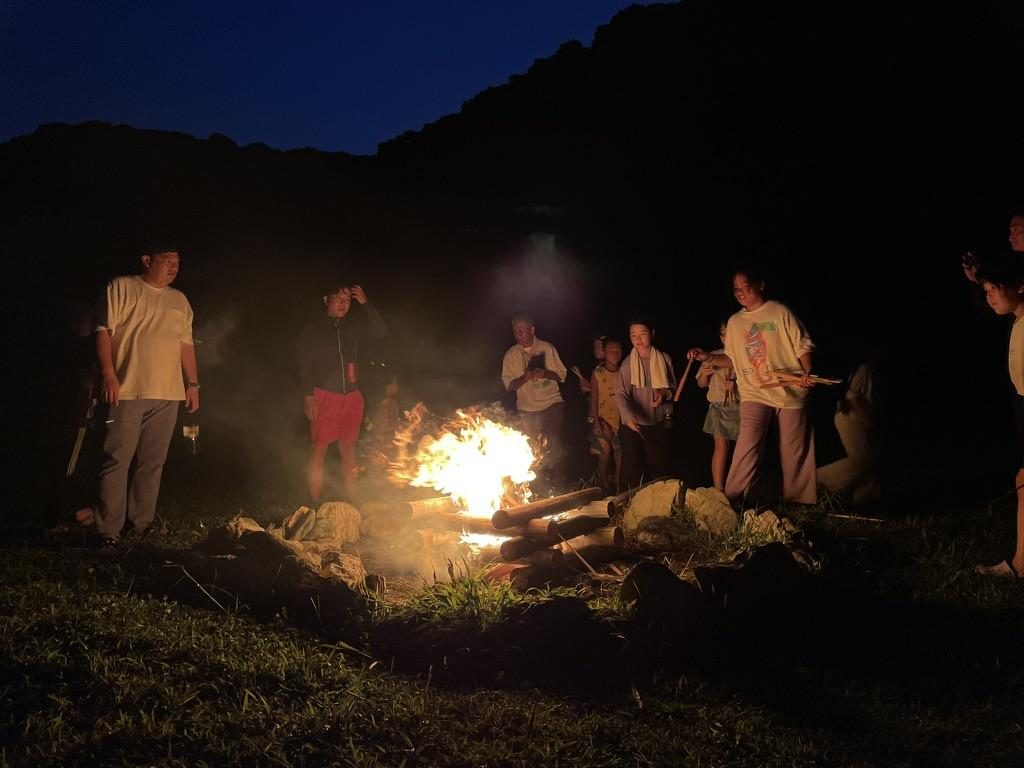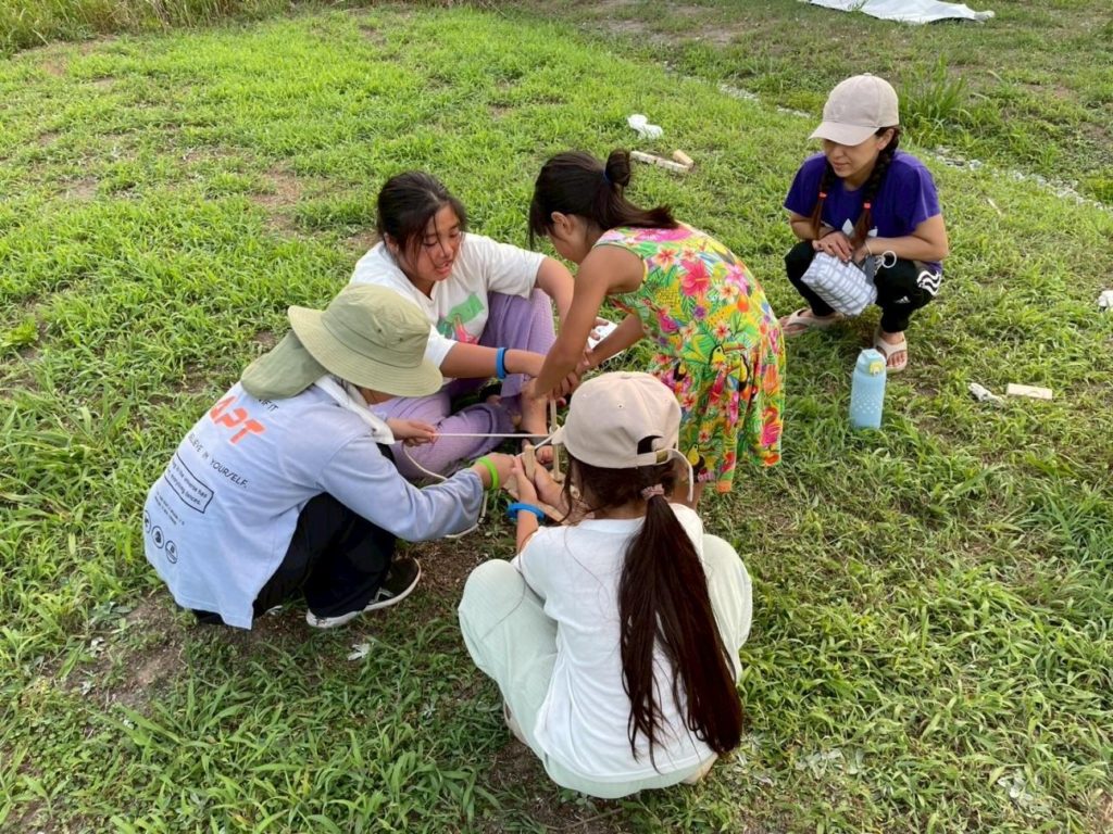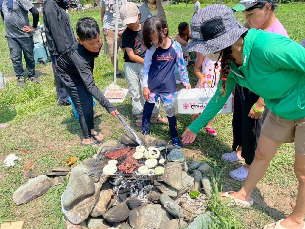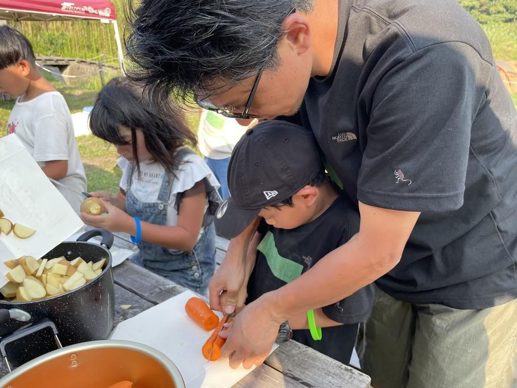 開会に先立ちアイスブレイクとして行ったウォーターサバゲーは、子どもVS大人の対決をし、一気に距離感が縮まったプログラムとなりました。昼食として、流しそうめんの竹細工づくりをはじめ実食し、1人では達成できないプログラムに大人・子どもの力を合わせて協力し合い達成経験が培われました。かまどづくりや魚の罠づくり、テントづくり、火起こしを行い、それぞれの成功体験が実を結ぶプログラムに挑戦し、就寝前にキャンプファイヤー・星座鑑賞を行い、様々なことにチャレンジする子どもたちにとって、達成経験を経て何事にも挑戦する必要性を大人の皆さまに感じていただきました。